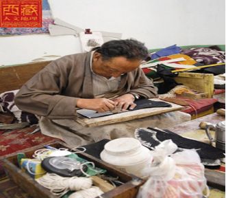 坐在工作臺上的赤列塔青,身材高大,穿一身合體的淺色藏裝,前擺上沾著幾星鼻煙,長期用針的手指有些變形。翻開他的履歷發(fā)現(xiàn),赤列塔青可以說是拉薩少有的制靴世家,他的父親邊巴頓珠在舊社會是個(gè)給人支差的貧苦鞋匠,靠給有錢人修鞋、做鞋為生。今年68歲的赤列塔青性格沉穩(wěn)、做事穩(wěn)健,他12歲當(dāng)學(xué)徒工,做鞋做了56年,如果再加上父輩的修鞋歷史,時(shí)間更長。在今天的拉薩有這樣經(jīng)歷的人算是屈指可數(shù)了。赤列塔青從小就在父親和師傅身邊打下手,逐漸掌握這個(gè)足以養(yǎng)家糊口的一技之長,終于成長為一個(gè)勤奮而多才的手工藝人,開始了穩(wěn)坐一隅的匠人生涯。