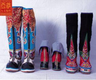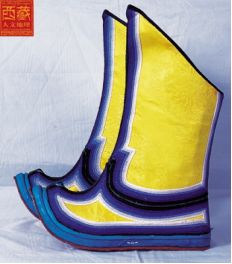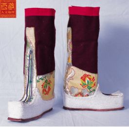 西藏高原地域遼闊,每個(gè)地區(qū)都有屬于自己的鞋子。藏族男女鞋,外觀雖然很像舞臺上古裝戲里穿的靴子,但用牛皮做底,底高二寸,腰高至小腿之上,鞋面用紅綠相間的毛呢裝飾,鞋腰也有線條、花紋,鞋幫用各色絲線或各色皮革、氆氌、金絲緞制成。人們能從一個(gè)人所穿的鞋子判斷出一個(gè)人的職業(yè)和社會階層。