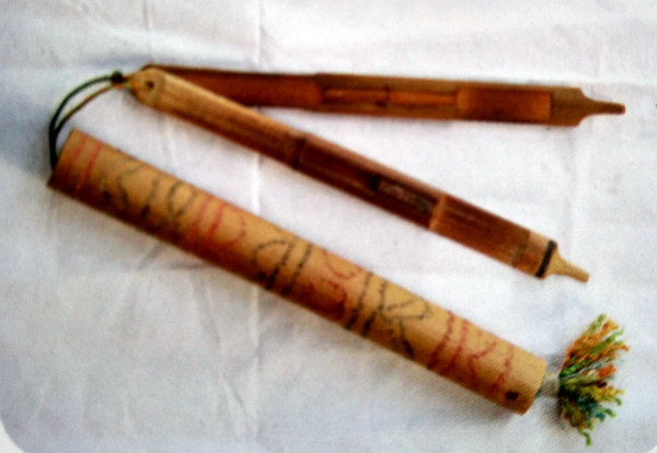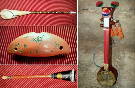 彝族特色樂器:補(bǔ)熱、阿烏和牛角小篳篥;右為彝族三弦