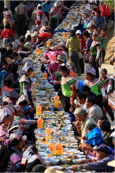 節(jié)日期間,哈尼寨子擺起長街宴,哈尼語叫“姿八多”,意為“互相輪流著敬酒”。小寨子擺一次,吃一天,大寨子則要擺兩三次,吃兩三天。每戶做一桌酒菜,抬到寨子街道上擺好,一戶接一戶沿著街道擺成長街宴,八個(gè)或十個(gè)人自愿結(jié)合為一桌暢飲。大寨子分片輪流做東,負(fù)責(zé)長街宴的酒菜,其他片的人做食客,從早吃到晚,場面十分熱鬧。