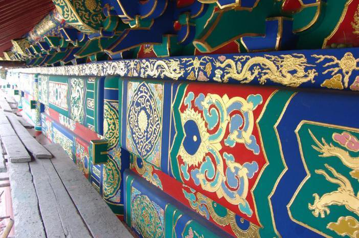 彩畫著色是一項關(guān)鍵的工序,不能有半點差錯。工匠們?yōu)椴煌伾O(shè)定了代號,一米色、二淡青、三香色、四硝紅、五粉紫、六洋綠、七佛青、八石黃、九紫色、十黑煙、十一紅等。將代號直接寫在地仗上,然后根據(jù)色號將各種色料對號入座,涂刷著色一、二遍,待干后再刷一遍光油罩光,以起保護作用。彩畫所用色料一般均為各色成品油漆。