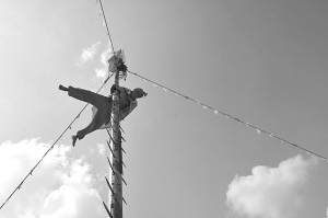 雖然符長洪教了理論絕招,可是在真刀、真火面前,第一次上場的徒弟們還是搖頭再搖頭,扭捏不敢上。此時,恰逢村里有人家邀請符長洪去表演,他就趁機(jī)帶著徒弟一起去。表演現(xiàn)場,符長洪用布包著刀刃,要幾個徒弟爬上刀梯。徒弟們上到梯頂后,符長洪卻把布條扯開,露出亮晃晃的刀刃,并在刀梯四周點燃火堆大喊:“下來吧!踩到刀上,走過火堆,你們就出師了!”