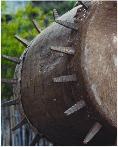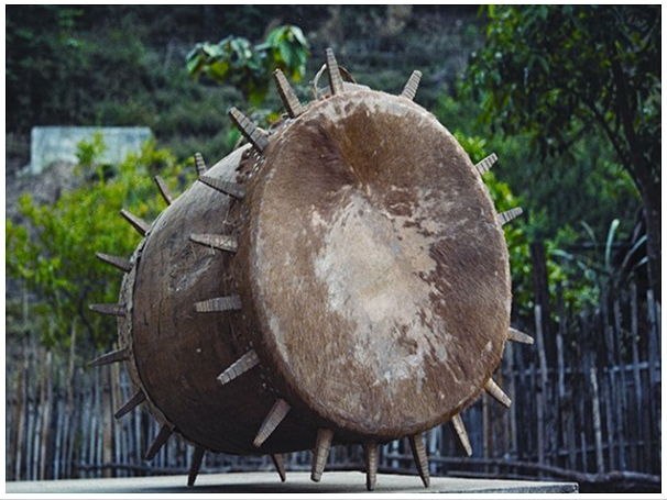 民族文化宮博物館藏基諾族木質(zhì)皮鼓,鼓面直徑55厘米,高88厘米,長約130厘米,20世紀八十年代征集于云南省西雙版納州景洪縣基諾鄉(xiāng)。鼓身為木質(zhì),呈圓柱形,兩端對稱。鼓有兩面,用牛皮蒙制。兩端鼓面邊緣各環(huán)繞嵌有花紋的上方下錐形的木棍(一側(cè)17根,另一側(cè)為20根),木棍長15厘米。鼓身兩側(cè)有方形孔,為鼓的音孔,上部有兩個把手,用于系繩懸掛木鼓。因鼓面兩端邊沿嵌有數(shù)十根鼓釘,形似太陽放射出的光芒,也稱為“太陽鼓”。