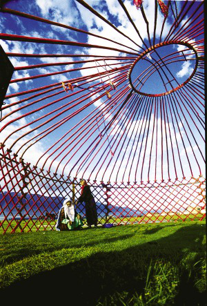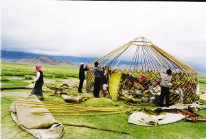 每戶人家的家就在那三四頭駱駝的背上,駱駝的先后排列也是有講究的。一般第一峰駱駝負(fù)責(zé)運(yùn)被褥,婦女和小孩也坐第一峰駱駝。后面的駱駝則運(yùn)衣服、日用品、食物、氈房的羊毛氈和氈房骨架。家里的男人們則騎著馬,趕著大群的牛羊緊跟在后面。平時(shí)來往較少的牧民們因?yàn)檗D(zhuǎn)場(chǎng),有了歡聚的機(jī)會(huì)。每天下午,牧民們就開始在路上安營(yíng)扎寨,男人們開始從駝背上卸下氈房,在路邊搭建臨時(shí)簡(jiǎn)易氈房;女人們生火煮飯,孩子們成群地奔跑嬉鬧,每家的牧羊狗或打架或形影不離。緩緩的炊煙在金色的黃昏中飄散,男人們開始圍在篝火旁喝酒唱歌,火光映紅每一張黝黑的臉龐,悠遠(yuǎn)的歌聲在空曠的夜空飄蕩。