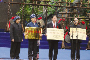 貴州省布依學(xué)會會長王思明(左一),向望謨縣授予“中國布依古歌之都”和“中國布依語言文字培訓(xùn)基地”之牌