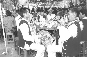 接著婚宴開始,八音隊(duì)吹奏的樂曲優(yōu)美動聽,大家喝喜酒祝賀新郎、新娘;同時(shí),男方家的帶娘給女方家人開檳榔碗。開檳榔碗的順序是女方家人由老到小分別接檳榔碗,意在感謝女方長輩、親屬對新娘的養(yǎng)育之恩。