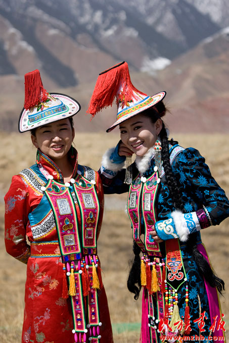 帽子是姑娘和已婚婦女的區(qū)別標(biāo)志。姑娘不戴帽子,前額戴“沙日達(dá)什戈”。這是一條寬約三寸長(zhǎng)約一尺,下邊緣用紅色或白色珊瑚小珠穿縫許多珠穗的紅色布帶。已婚婦女身穿高領(lǐng)偏襟長(zhǎng)袍,一般由綢、緞、布、褐、皮料縫制。衣領(lǐng)高齊耳根,袍子一般以綠、藍(lán)色為主,但也有深紅、紫紅等顏色。袍子下擺兩邊開(kāi)衩,衣袖口至肘部用各色織錦緞、彩綢、彩緞花邊一圈圈縫綴裝飾。腰系腰帶(裕固族也叫“胡兒”,即系腰),主要是桃紅色或綠色,長(zhǎng)袍上面罩一件高領(lǐng)偏襟坎肩,但也有無(wú)領(lǐng)偏襟坎肩。
