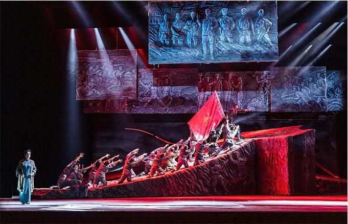 在舞蹈語言的設(shè)計(jì)上,編導(dǎo)融入當(dāng)代元素,使觀眾不但感受到審美的親切與現(xiàn)代感,而且還自然地進(jìn)入回望歷史的情境,對其思想內(nèi)涵的理解更為準(zhǔn)確。該劇的道具使用和調(diào)度也頗為大氣,令人印象深刻。一組斜坡狀的大型舞臺道具不但由群眾演員直接移動而實(shí)現(xiàn)即時(shí)的場景調(diào)度,還可使演員上下和左右而行,最終組合成巨大的中國共產(chǎn)黨黨徽,輔助完成了人民英靈和英雄的形象塑造。