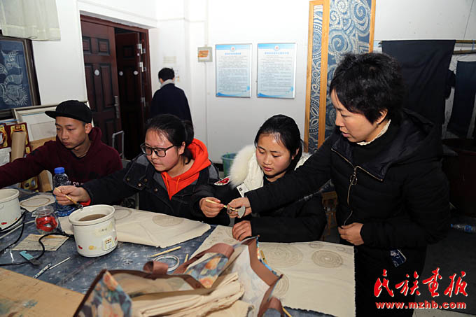 吳安麗老師(右一)在凱里學院藝術(shù)學院蠟染實訓室指導學生