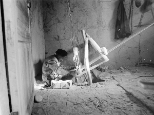 紡線車高約80厘米,寬約60厘米,長(zhǎng)約22厘米。紡線車也和切克曼一樣古老,完全靠手工搖,沒(méi)有絲毫機(jī)械動(dòng)力。老人紡線時(shí),右手搖動(dòng)紡線機(jī),左手慢慢放絨,把比普通棉紗線粗兩三倍的絨線纏繞在錠上。這個(gè)工序叫做加捻和卷繞。隨著紗條抽長(zhǎng)拉細(xì),纖維變得更加平直,紗條強(qiáng)力下降,容易斷裂或延伸,因此需要加上適當(dāng)捻度使其具有一定的強(qiáng)力。這個(gè)過(guò)程結(jié)束后,老人起身說(shuō):“經(jīng)過(guò)加捻和卷繞之后,要用水沖洗,晾干后就可使用了?!?/p>