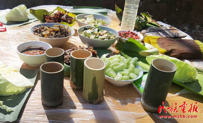 基諾族地區(qū)食材豐富,一日三餐,以大米為日常主食,雜以玉米、瓜豆等。每年5—9月的雨季,基諾山漫山遍野是食材,山藥、水芹菜、竹筍、魚腥草及各種菌類等無污染且很新鮮,是難得的烹飪材料,經(jīng)過簡單處理就成為餐桌上的美味佳肴?;Z族民間有句俗話,叫“漢炒、傣蘸、基諾舂”,也就是說漢族人喜歡吃炒菜,傣族的菜喜歡蘸著調(diào)料吃,基諾族的菜則以臼舂為主?;Z族的肉類的吃法較多,可以腌成干巴,也可吃新鮮的。酸腌魚、涼拌茶也是基諾族的最愛,基諾人做飯就餐均在竹樓二層的火塘周圍進(jìn)行,有一定的禮節(jié)和講究?;Z族吃飯時(shí),主人首先要在火塘東側(cè)獻(xiàn)一點(diǎn)飯菜祭祀祖先和灶神,吃飯時(shí)全家人按順序在火塘旁圍蔑桌而坐,家長正對火塘,客人靠火塘而坐。