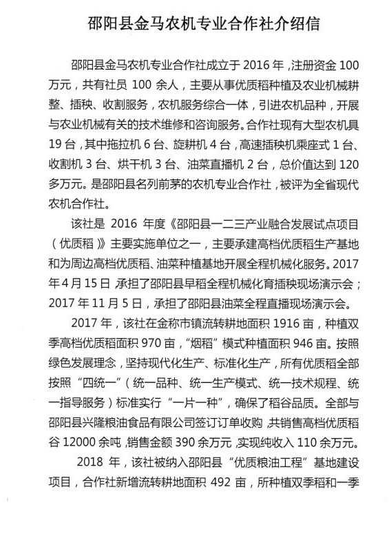 在農(nóng)機專業(yè)合作社的幫助下,當(dāng)?shù)剞r(nóng)業(yè)生產(chǎn)過程的機械化程度非常高。邵陽縣金馬農(nóng)機專業(yè)合作社,位于邵陽縣金稱市鎮(zhèn)石馬村,主要提供組織農(nóng)業(yè)機械耕整、插秧、收割服務(wù),大大提高了當(dāng)?shù)氐姆N植和生產(chǎn)效率。