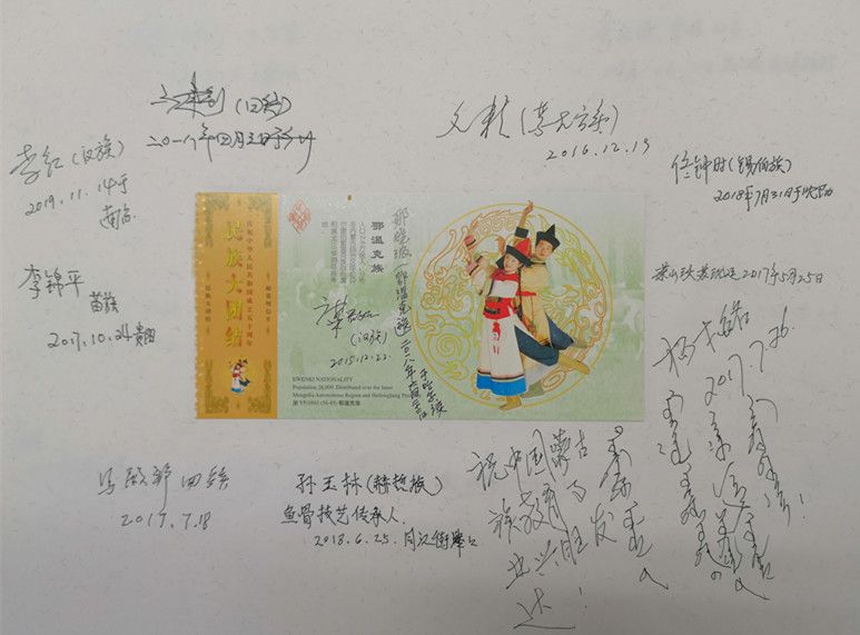 在采集口述影像錄音資料的同時,項目組還收集了大量的珍貴歷史照片以及相關(guān)文物。值得一提的是,他們設(shè)計了一種非常有特色的受訪者簽名簿,中間貼著繪有56個民族的音樂舞蹈圖案的首日封或明信片,四周簽上受訪者的人名簽名字、民族特征,有些還用民族文字書寫,體現(xiàn)了中華各民族團結(jié)在一起的精神風貌。簽名簿有厚厚的幾大本,設(shè)計精美,承載著民族工作口述史資源采集的經(jīng)歷,具有豐富的文化內(nèi)涵和博物館收藏價值。