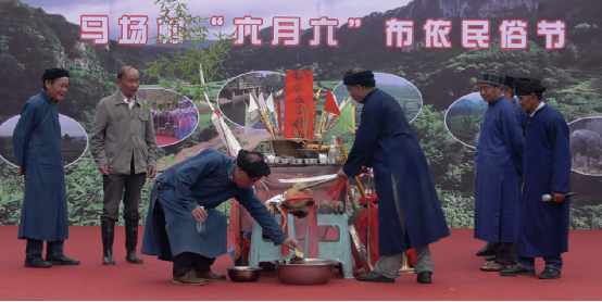 祭祀活動由寨老主持。牛頭、活雞等祭品供于案前,寨老穿著布依族的藍(lán)袍,誦頌著古老神秘的經(jīng)文,黝黑的臉上寫滿了對祖先、神靈的虔誠。而其他幾位德高望重的寨中老人,這時便協(xié)力殺了雞,人們用雞血淋紙旗插于火盆中,以火盆代替稻田,意為雄雞吃盡蝗蟲,糧食豐收,馬馱不盡。