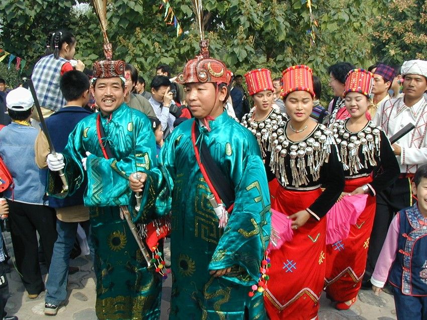 目瑙節(jié):又稱“總戈”,景頗語音譯,意思是“大伙跳舞”。目瑙節(jié)是景頗族最盛大的傳統(tǒng)節(jié)日,一般于每年農(nóng)歷正月十五以后的九天內(nèi)擇雙日舉行,節(jié)期三至五天不等。目瑙作為一種大型的群眾性歌舞活動(dòng),由來已久,歷史上,每逢豐年,出征、凱旋、婚姻嫁娶、敬祭鬼神等重要活動(dòng),均要跳“目瑙”。景頗族的“目瑙縱歌”原來是一種融宗教和文化習(xí)俗為一體的傳統(tǒng)慶典。隨著社會(huì)的發(fā)展,逐漸演化為各種不同類別的“目瑙”。大致有以下幾種:①“歲目瑙”,家庭財(cái)源茂盛,人丁興旺時(shí)舉行;②“布當(dāng)目瑙”,征戰(zhàn)取得勝利時(shí)舉行;③“貢冉目瑙”,同胞兄弟分家自立門戶時(shí)舉行;④“騰肯目瑙”,新建房屋住所落成時(shí)舉行;⑤“空然目瑙”貴族家娶親辦婚禮時(shí)舉行;⑥“達(dá)如目瑙”,出征時(shí)舉行;⑦“昔目瑙”,有名望的長者去世送葬時(shí)舉行;⑧“柱目瑙”,祭奠“木代”神時(shí)舉行。不同類別的“目瑙”都有特定的內(nèi)容和表現(xiàn)形式,但有一個(gè)共同點(diǎn)就是整個(gè)過程都是由“瑙雙”(領(lǐng)舞)隊(duì)和“瑙巴”(表演)隊(duì)組成的舞隊(duì)來表現(xiàn)和完成的。每逢目瑙節(jié)日,村村寨寨的景頗人身著節(jié)日盛裝,紛紛從四面八方涌入目瑙廣場(chǎng)。廣場(chǎng)上人山人海,氣氛熱烈歡快而不失莊嚴(yán)古樸的特色。廣場(chǎng)中央高豎著四根長約4米的目瑙柱,亦稱雌雄柱,中間兩根為陰,外面兩根為陽,上面皆繪有精美而富有象征意義的圖案:右邊柱上往往繪以蕨菜花紋,象征團(tuán)結(jié)奮進(jìn);左邊常畫回紋構(gòu)成若干個(gè)四方形,并涂以不同顏色,表示景頗族的遷徙路線;中間兩根柱子之間,交叉著兩把長刀,為景頗民族驍勇強(qiáng)悍、堅(jiān)強(qiáng)剛毅性格的具體標(biāo)志。目瑙柱的左側(cè)立著一個(gè)方形架子,上層是吹嗩吶的座位;前面掛著一個(gè)兩米長的大皮鼓和一面直徑一米多的大芒鑼,供跳舞時(shí)伴奏用。廣場(chǎng)四周用竹籬笆圍起,目的是為了防止野鬼的侵入和牲畜的干擾。舞蹈開始時(shí),鼓樂齊鳴,由兩位德高望重且又熟悉目瑙舞路線的老人身穿大龍袍,頭戴飾有孔雀、野雞羽毛和野豬牙齒的目腦帽,手持長刀領(lǐng)頭,后面跟著背銅炮和持長刀的隊(duì)伍,婦女們拿著扇子或彩帕跟在最后,邊歌邊舞,熱鬧非凡。參舞者少則百多人,多則幾千人,從清晨到日暮,以日暮到清晨,通宵達(dá)旦,其間舞者跳累時(shí)可自動(dòng)退場(chǎng)小歇片刻,然后繼續(xù)登場(chǎng)舞蹈?!澳胯Эv歌”作為一個(gè)民族的傳統(tǒng)活動(dòng)發(fā)展至今,宗教色彩和類別已日益淡化,它已成為景頗族約定俗成的傳統(tǒng)節(jié)日,統(tǒng)稱為“統(tǒng)肯(傳統(tǒng))目瑙”并賦予了新的內(nèi)涵,其內(nèi)容和形式都是展示一個(gè)民族的傳統(tǒng)文化,反映今天的新生活和對(duì)未來的美好向往。