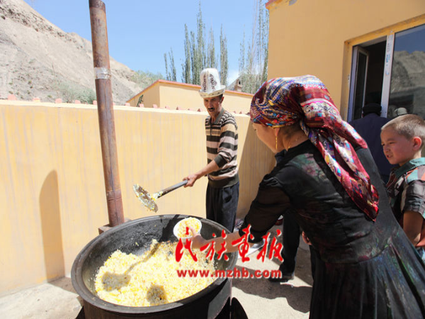 由于我們是遠(yuǎn)道而來(lái)的客人,女方家邀請(qǐng)我們進(jìn)屋品嘗抓飯、牦牛肉。我們了解到,新婚夫婦是一個(gè)村的,他們?cè)诟=ㄈ荽蚬r(shí)彼此相識(shí)。今天是婚禮的第二天,真正的柯爾克孜族婚禮要辦整整三天呢!