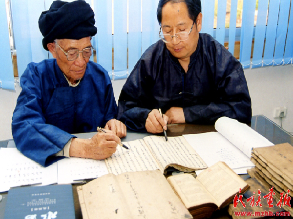 韋章炳先生獲得了黔南州首批非物質文化遺產傳承人榮譽稱號,圖為第十三代水書傳人韋光榮與韋章炳先生一起翻譯水書