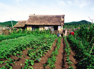 赫哲族人多用鍬把粗的柞木夾成障子,形成院落。房屋前面留塊院子,養(yǎng)雞、豬,放醬缸、農(nóng)具,碼著成排的木柈子垛;房后的菜園子較大,種些架豆角、黃瓜、茄子、小蔥、辣椒、西紅柿等蔬菜。黑龍江同江市街津口村的街道東西走向,道南的房子從后面開(kāi)門繞過(guò)山墻進(jìn)院,菜園子在前院;道北的房子從前門穿過(guò)菜園子邊的巷道到前院再進(jìn)屋。