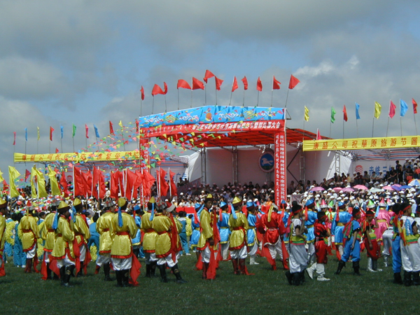 大草原最宜人的時(shí)節(jié)莫過于七八月。屆時(shí),蒙古族牧民們,就會(huì)穿上盛裝,不管路途多遠(yuǎn),男女老少,舉家乘車騎馬,云集到綠海如茵的草原上。世界各地的游人也會(huì)紛至沓來,素日寧靜的草原頓時(shí)沸騰起來,藍(lán)天白云之下,彩旗飄揚(yáng),人流涌動(dòng),羊歡馬叫,呈一派繁榮景象。這就是蒙古民族一年一度的草原盛大節(jié)日——那達(dá)慕大會(huì)隆重開幕。