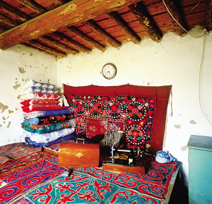 新疆維吾爾自治區(qū)木壘縣大南溝烏孜別克民族鄉(xiāng)鄉(xiāng)政府為烏孜別克牧民集中興建了定居房。新村街道整齊,土墻圍成的院落獨(dú)門獨(dú)院。院落很大,前院種菜栽樹,有水井,房后是牛欄羊圈。有的還單建了廂房作廚房。這里的住房都是長方形土坯平頂房,玻璃窗,墻壁很厚,冬暖夏涼。屋內(nèi)橫梁和走廊的木柱、木梁上有的是工筆重彩的花紋圖案,有的用雕花石膏鑲嵌或磚、木雕刻后鑲嵌,做工精細(xì)。墻壁上有整齊排列的拱形壁龕,里面擺著日用品和工藝品,四周也鑲嵌著花紋圖案。居民們住板炕,在屋里地上挖一小坑,坑內(nèi)放置火爐,鐵皮煙囪通向室外,坑上橫搭木板成板炕,板炕上鋪花氈坐毯??繅σ贿厰[著疊得整齊的被褥,繡花枕頭對(duì)稱地立在被褥上。墻上掛著壁毯,整個(gè)室內(nèi)既有局部美,又有整體美,賞心悅目。