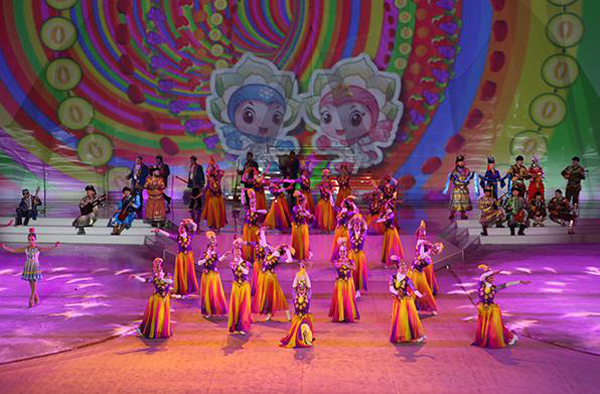2016年1月20日,為期11天的第十三屆全國冬季運動會在烏魯木齊冰上運動中心速滑館拉開大幕。開幕式由體育儀式、文體表演和點燃主火炬塔三個部分組成。在文體表演章節(jié),承擔本次開幕式文體表演與伴舞任務(wù)的新疆藝術(shù)學院200名學生與來自新疆各民族的文藝工作者一起,為觀眾獻上了一臺精心策劃和編排、以“冰雪天山陽光絲路”為主題的精彩表演。參加開幕式文體表演的舞蹈系2014級、2015級學生,大部分是第一次參加國家級的大型活動,他們克服嚴寒,用自己的實際行動為精彩冬運會助力添彩