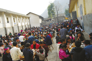 每年秋收后到翌年播種前,是四川涼山金陽(yáng)縣人結(jié)婚的黃金季節(jié)。無(wú)論是在縣城還是農(nóng)村,不管是吃“九斗碗”,還是吃“坨坨肉”,大家都喜歡擺壩壩宴。在金陽(yáng)縣城,常??梢钥吹竭@樣一幅景象:數(shù)百人聚在一處,圍坐于一張張方桌旁,伸箸暢食,舉杯暢飲。一盆盆肉端上桌子,主人不停地招呼客人趁熱吃。