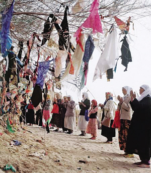 在新疆,尤其是在維吾爾族聚居的南疆,普遍存在類似內(nèi)地廟會式的麻扎朝拜活動。朝拜者面向麻扎傾訴心中的哀怨痛苦,以各種方式表達(dá)自己的祈求:有向麻扎求消災(zāi)避禍的,有求富貴發(fā)財?shù)?,還有求夫妻和睦的,求理想伴侶的,求生兒育女的,求老有所養(yǎng)的,求天降甘霖的……