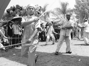 今年潑水節(jié)期間,景洪市嘎灑鎮(zhèn)傣族民間藝人進行武術表演