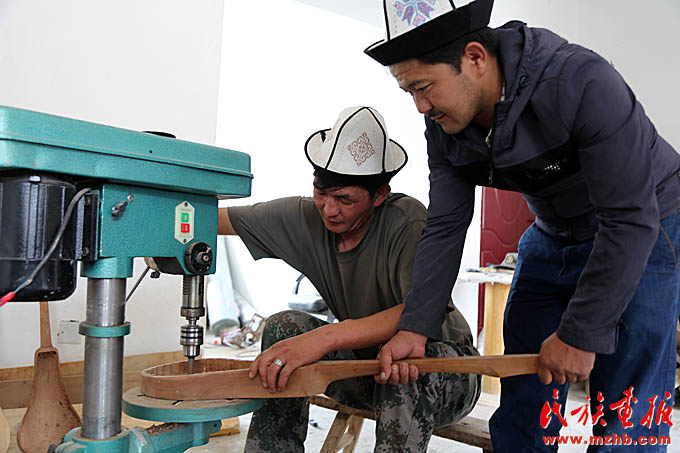 這間工作室的主人叫阿吉別克·買買達(dá)洪,主人恰巧有事外出,他的弟弟,年輕朝氣的吾蘭別克張羅著給記者們當(dāng)起了翻譯。正忙活著打磨樂器的小伙叫木沙,今年31歲,問起庫姆孜的制作工藝,他才把頭抬起來,笑著說:“我做這個(gè)十年了。一把庫姆孜,往往琴身是杏木,蓋子是松木。杏樹、松樹木切割后放在干燥的地方,一兩年后才能用?!睅炷纷斡腥?,琴弦以前用動物的腸子手工自制,現(xiàn)在有的工匠開始使用現(xiàn)成的弦。判斷庫姆孜手工藝人手藝高低的關(guān)鍵何在?木沙解釋說,“要看彈出來的聲音。木頭的原料不同,出來的聲音也不同?!边@個(gè)回答似乎也隱藏了手工藝人的絕活所在,可意會不可言傳的技藝,往往在一代代的工匠手中以師徒親授的方式傳承。