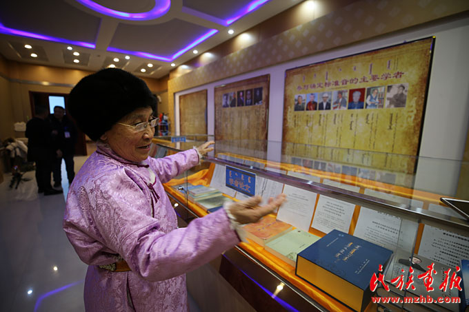 其木格老人向參觀者介紹正藍(lán)旗方言被確定為中國(guó)蒙古語(yǔ)標(biāo)準(zhǔn)音的歷史
