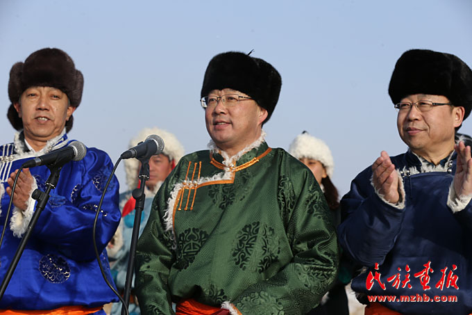 錫林郭勒盟委副書(shū)記、行署盟長(zhǎng)霍照良(中)宣布那達(dá)慕開(kāi)幕