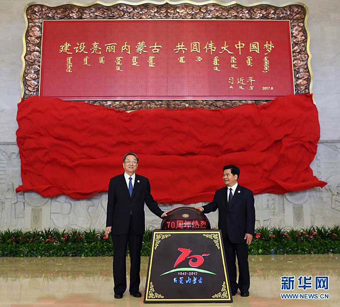 70年來(lái),在黨中央高度重視、關(guān)心關(guān)懷下,內(nèi)蒙古各族人民在革命、建設(shè)和改革的各個(gè)歷史時(shí)期,創(chuàng)造了一個(gè)又一個(gè)人間奇跡,萬(wàn)里草原發(fā)生了翻天覆地的歷史巨變。圖為8月7日,中共中央政治局常委、全國(guó)政協(xié)主席、中央代表團(tuán)團(tuán)長(zhǎng)俞正聲率中央代表團(tuán)出席向內(nèi)蒙古自治區(qū)贈(zèng)送紀(jì)念品儀式,俞正聲和內(nèi)蒙古自治區(qū)黨委書(shū)記、人大常委會(huì)主任李紀(jì)恒一同為習(xí)近平總書(shū)記題詞賀匾揭幕(新華網(wǎng))