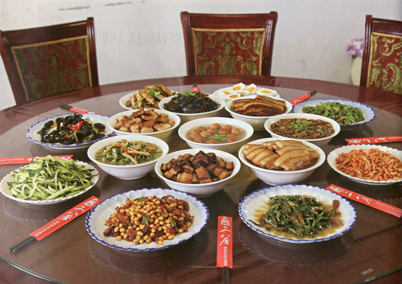 “二八席,八個(gè)盤、八個(gè)碗,八盤涼菜、八碗熱菜,講究葷素搭配,涼菜以時(shí)令蔬菜為主,可隨季節(jié)自由搭配,熱菜相對(duì)固定,即為紅木梳背和白木梳背、紅剪子和白剪子?!崩铠P友像說順口溜一樣道出了二八席的基本構(gòu)成。