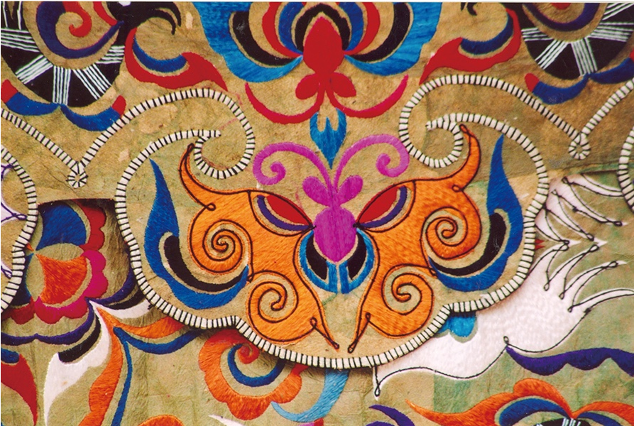 在苗族各種工藝的服飾圖案中,蝴蝶是俯拾皆是的,而丹寨縣雅灰鄉(xiāng)和榕江縣高排鄉(xiāng)等地的苗族百鳥(niǎo)衣上,大面積地使用絲帛和絲線刺繡,常在中心位置繡著一種奇特造型的動(dòng)物圖案,頭是變形的鳥(niǎo)頭,身是蟲(chóng)身,有節(jié),周圍是飛舞的蝴蝶。不少人解釋它為龍。其實(shí)那是蠶蟲(chóng)、鳥(niǎo)、蝴蝶的結(jié)合:蝴蝶——鳥(niǎo)——蠶蟲(chóng)——一幅圖本身就包含了蝴蝶圖騰的全部寓意。