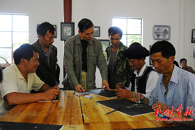 為了創(chuàng)作更好的作品,阿峨新寨村的版畫藝術家們經常聚在一起討論切磋