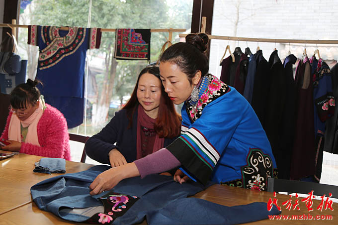 在古色古香的云南省楚雄市彝人古鎮(zhèn),排排具有民族風情的街鋪門面中,有家令人耳目一新的店面,僅是它素雅的名字和文藝的裝修,就不斷吸引著路過的游客前去一探究竟,這就是楚雄索玉文化美學創(chuàng)意有限公司工作室的所在地?!昂芏辔乃囆∏嗄赀M店后,被我們家精致的創(chuàng)意彝繡飾品和服飾所吸引,拿起來愛不釋手?!彼饔竦脑O計師盧潔瑩說道。盧潔瑩的氣質就如工作室的布置風格一樣,溫文儒雅又落落大方,她身穿一身自己設計的彝繡服飾,正俯身指導著員工。