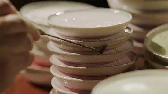在每一個(gè)點(diǎn)藍(lán)的師傅面前,都由低到高排著一摞白色小碟,里面是摻了水的釉料。細(xì)看去,同樣是紫色,但從深紫到淺紫,竟然能分出十多種層次來。制作精良的景泰藍(lán)作品,對(duì)點(diǎn)藍(lán)要求很高。一片花瓣,要描繪顏色的漸變,就要由深入淺潤(rùn)染幾個(gè)層次,才能表現(xiàn)出花朵特有的美感——這也是景泰藍(lán)的魅力所在,如果一朵花瓣只涂一二種顏色,功夫省了,景泰藍(lán)之美也消失了。