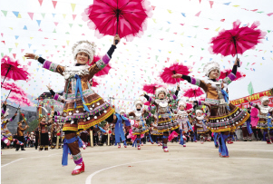 “打同年”是融水縣苗、侗和瑤等少數民族的文化傳統(tǒng),一般是村與村之間相約在春節(jié)期間進行,聯誼雙方互稱“同年”。整個活動一般持續(xù)三天,包括進寨儀式、蘆笙聯歡、圍同年儀式、聯歡晚會、百家宴等。雙方通過吹蘆笙、跳蘆笙舞、對歌等多種傳統(tǒng)方式聯歡,增進交往交流交融。