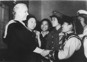 1955年9月蘇聯(lián)卓婭和舒拉的媽媽(左一)訪問中國時(shí)接見中國的“瓦爾瓦娜”(蘇聯(lián)電影《鄉(xiāng)村女教師》女主角)、全國青年社會(huì)主義建設(shè)積極分子阿角(右一),時(shí)有郝建秀(左三)、徐建春(左二)同志在場(chǎng)。 資料圖片