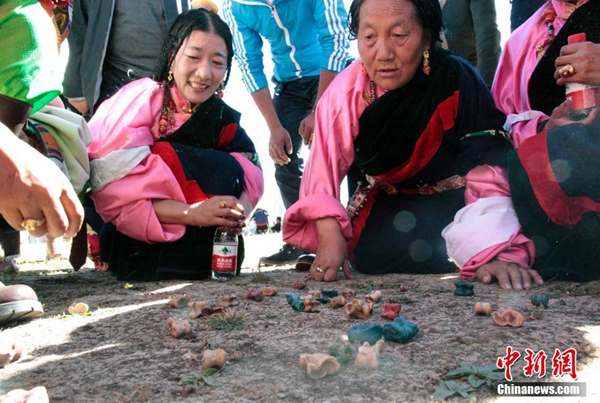 圖為青海省玉樹藏族自治州民眾玩貼改(骨節(jié))來慶?!般逶」?jié)”的到來。來源:中新社 攝影:孫睿