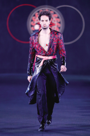 課題組將彝族銀飾經(jīng)典的浮雕圖案元素、彝族畢摩繪畫和文字元素、彝族服飾傳統(tǒng)紋樣圖案元素、彝族鸚嘴帽元素、朵洛荷舞蹈元素、察爾瓦流蘇元素等融入到作品中,沿用傳統(tǒng)民族服裝的色調(diào),并對(duì)圖案和造型進(jìn)行現(xiàn)代設(shè)計(jì)和審美的轉(zhuǎn)化與提升,傳統(tǒng)服飾與現(xiàn)代創(chuàng)新設(shè)計(jì)相結(jié)合,碰撞出了新的時(shí)尚美感。