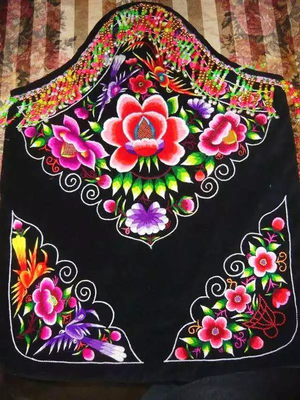 彝族婦女圍腰,是女性審美的結(jié)晶,實(shí)用美觀。圍腰是最能集中體現(xiàn)彝族女性心靈手巧的女紅作品,因此成為青年男子傳統(tǒng)擇偶的重要標(biāo)準(zhǔn)之一。每條彝族圍腰,須經(jīng)過剪紙、裁剪、刺繡、挑花、配飾等環(huán)節(jié),每一個細(xì)微的過程都傾注了彝女的聰明與才智。事實(shí)上,彝族婦女圍腰,還蘊(yùn)含著重要的彝族社會歷史、文化信息。