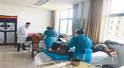 做完藏藥浴的患者在接受涂擦治療。