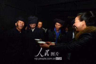 11月17日凌晨,新娘家的親戚在“發(fā)親”前與新郎家派來的“關(guān)親客”對(duì)歌敬酒。