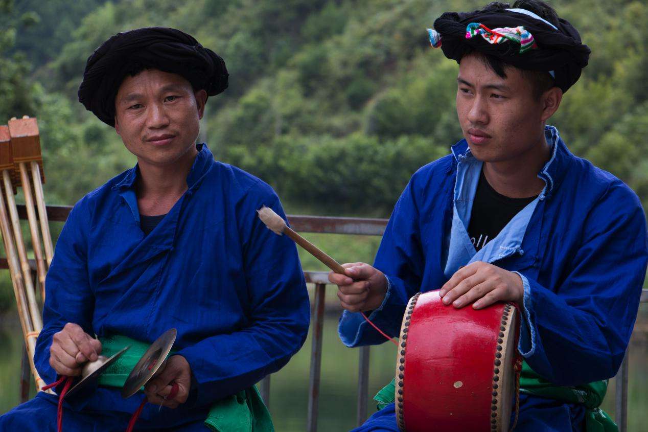 改毛村苗族村民的傳統(tǒng)服飾至今保留完好,而且現(xiàn)在村內(nèi)的苗族人都還有穿著本民族傳統(tǒng)服飾的習(xí)慣。改毛村的苗族男性一般頭戴黑色絲帕裹成的帽子,絲帕里裹有彩色絲巾。穿著藍色打底的斜襟長衫,腰部系有綠色腰帶。