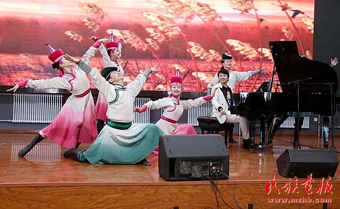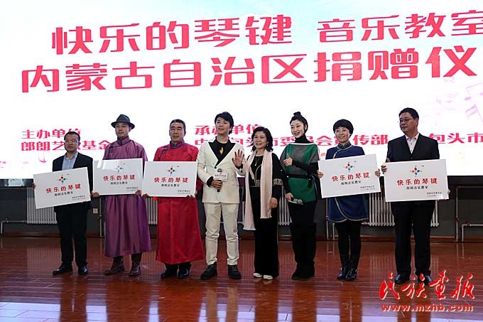 在“快樂(lè)的琴鍵”音樂(lè)教室捐贈(zèng)儀式上,朗朗與內(nèi)蒙古藝術(shù)劇院直屬烏蘭牧騎演員聯(lián)合表演了《鴻雁》。