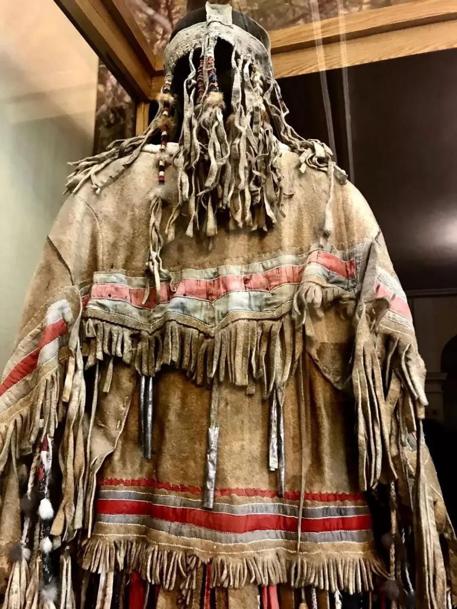 展區(qū)內(nèi)還陳列著幾套保存完整的薩滿服飾,有鹿皮、獸皮、魚皮和纖維等多種材料。與國內(nèi)留存的薩滿服飾不同的是其鹿角帽的制作,鹿角帽上裝飾著龜、蛇和神偶形象,頂端八岔鹿角的材料是金屬。