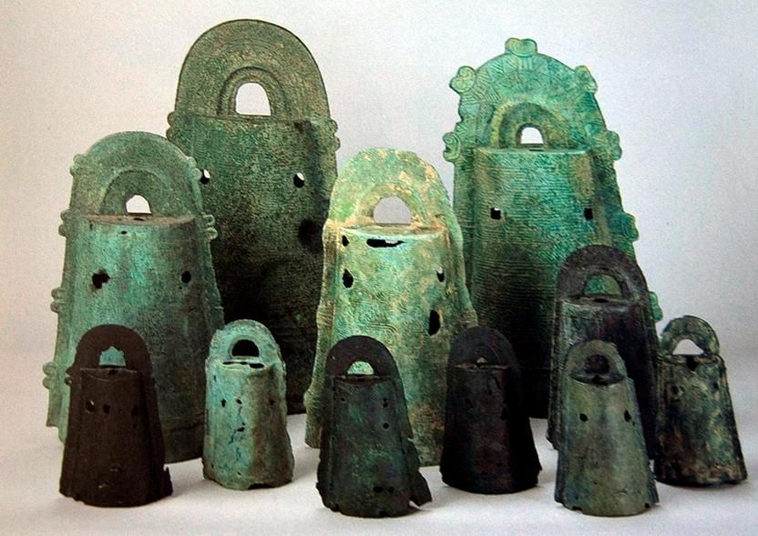 彌生時(shí)代也是機(jī)織布技術(shù)傳播,金屬器的使用和制造開始的時(shí)代。銅鐸,是日本本土生產(chǎn)的一種器型,為祈愿豐收時(shí)祭祀用的鳴鐘,常見于貴族墓葬中。使用的時(shí)候僅敲擊單獨(dú)一件,與中國成組配套使用的編鐘不同。