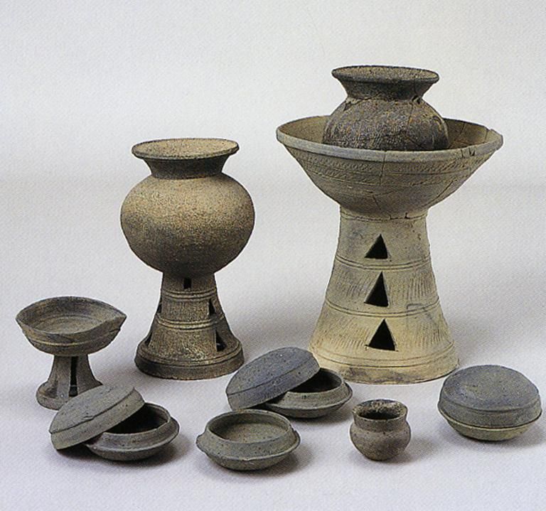 古墳時(shí)期另一種陶器為須惠器(圖十二),比土師器精美。它在古墳時(shí)代中期才從大陸引進(jìn)而來,由朝鮮半島的“陶部”工人在相對(duì)集中的場(chǎng)所制作,采用輪制技術(shù),器物呈青灰色,器形富于變化,主要為壺、瓶、盤、碗和高腳杯等。