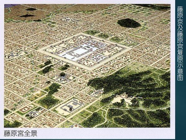 飛鳥-奈良時(shí)代對(duì)作為中央集權(quán)國家的象征的都城建設(shè),極其重視。藤原京是持統(tǒng)、元明、元正三代天皇延用了16年的都城遺址,這個(gè)遺址經(jīng)過幾十年的考古發(fā)掘,已經(jīng)探明了藤原京和藤原宮的范圍及布局(圖二十)。京城東西及南北各長(zhǎng)5.3km,平面近正方形,宮城在其中央,這點(diǎn)與唐長(zhǎng)安城不同。有學(xué)者認(rèn)為,藤原京是以《周禮》規(guī)定的理想化都城建制為依據(jù)所筑成的。